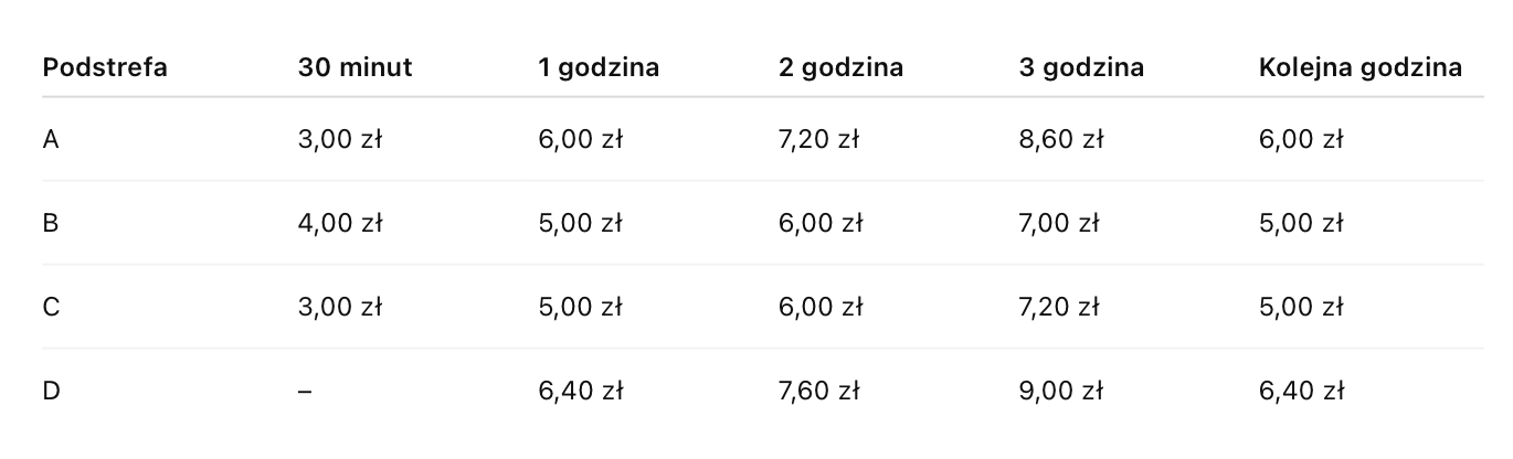 w podstrefach A, B i C: pierwsze 120 minut postoju bezpłatnie (albo 2 × 60 minut w ciągu dnia); bezpłatny bilet trzeba pobrać w parkomacie lub aktywować w aplikacji,